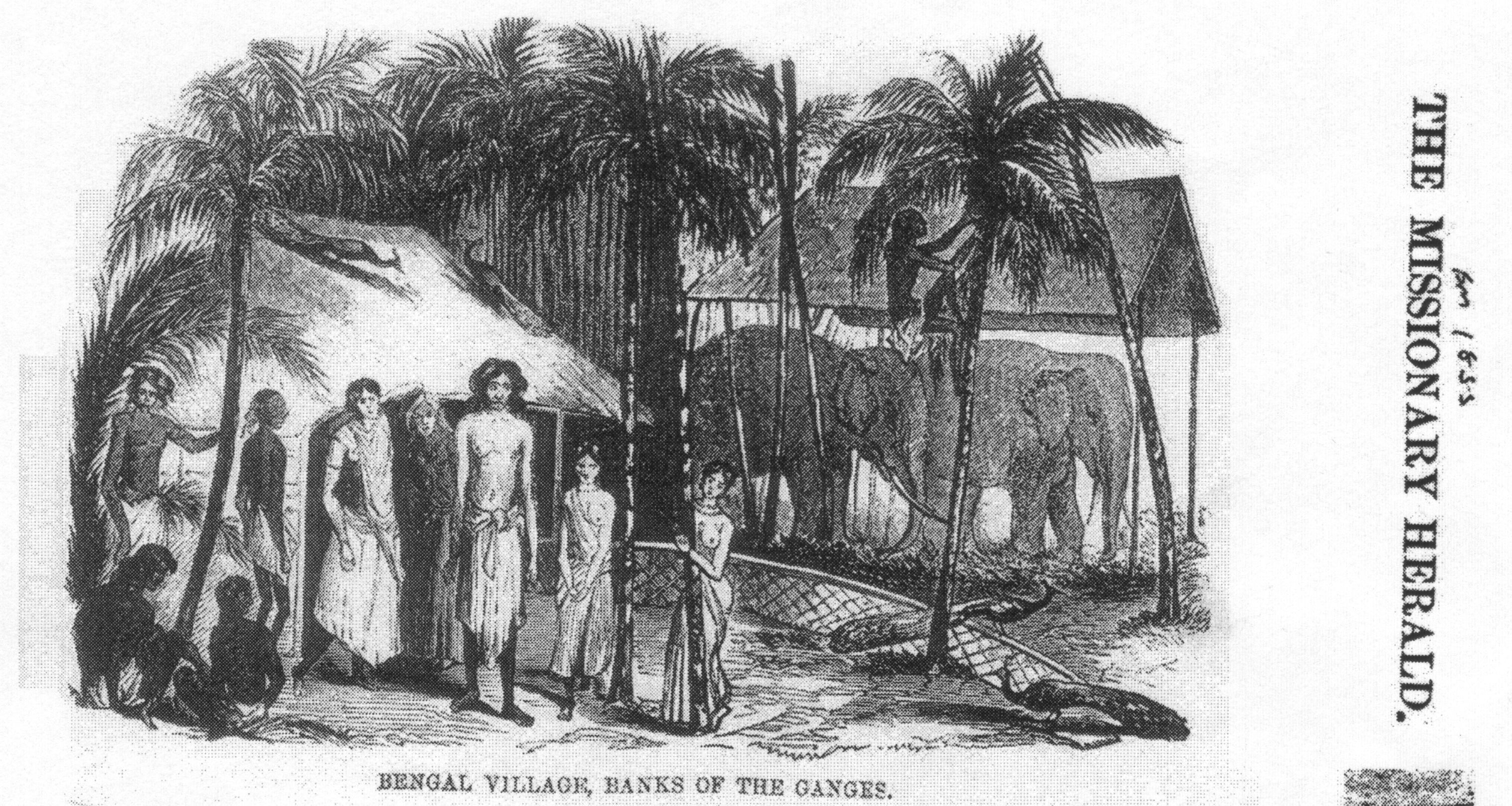 Bengal village ca. 1840 as represented in a Christian missionary magazine.