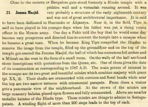 That is the Masjid-i-Ala or Jama Masjid standing in Srirangapatanam on the site of a Shiva temple. One need not comment on Kirmani’s statement that Tipu “purchased the temple from the adorers of the image … with their goodwill”. It is not unoften that terror has produced this sort of goodwill in the minds of its helpless victims. – Excerpted from the Preface to Tipu Sultan: Villain or Hero